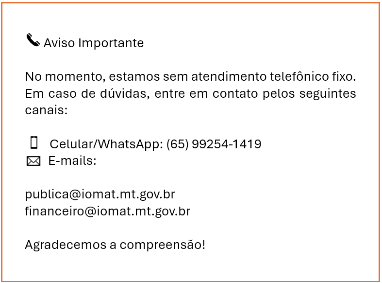 A IOMAT estará atendendo através dos e-mails publica@iomat.mt.gov.br e com problemas na publicação através suporte@iomat.mt.gov.br. Geral: 3613-8000 - www.iomat.mt.gov.br Publicações: 3613-8003 ou 3613-8004 - publica@iomat.mt.gov.br Suporte: 3613-8002 –...